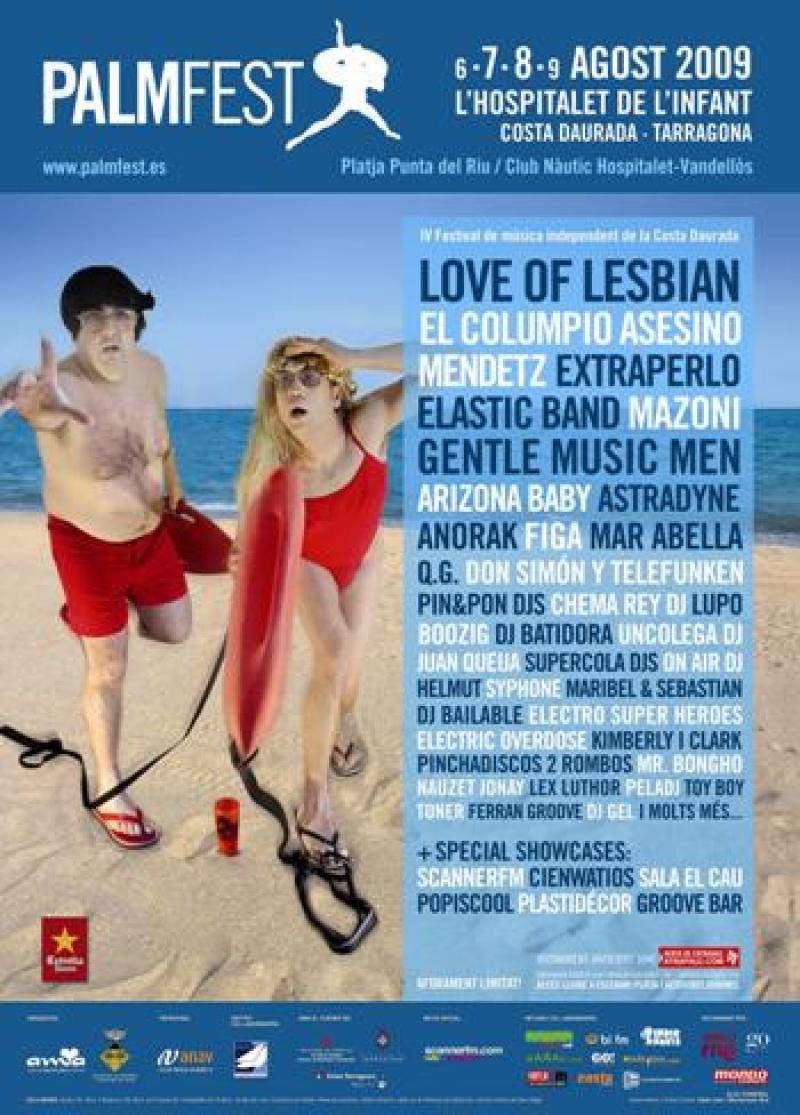 Hospitalet de l'Infant. Costa Daurada. L’Associació Cultural Alternativa (AMA), juntament amb l’Ajuntament de Vandellòs i l'Hospitalet de l'Infant, ja tenen a punt una nova edició del festival Palmest, que serà entre el 6 i al 9 d’agost de 2009. Aquesta és una de les propostes més fresques de l’estiu amb dj’s, sessions pop, electròniques i altres activitats lúdiques i esportives paral•leles i complementàries en el marc incomparable de les platges del municipi, concretament la platja de la Punta del Riu i el Port Esportiu de l’Hospitalet de l’Infant. Carlos Areces i Anibal Gómez (Ojete Calor / Muchachada Nui) protagonitzen enguany la nova imatge del festival, que comptarà amb Love of Lesbian, Mendetz, El Columpio Asesino, Mazoni, Gentle Music Men, Anorak, Astradyne, Don Simon & Telefunken i Chema Rey Dj. A més, cal afegir algunes de les formacions que amb seguretat més faran parlar en els propers mesos, com és el cas dels granadins Elastic Band i els Arizona Baby. A la programació també hi haurà directes purament electrònics com el del francés Q.G., una de las sensacions de l’any en el panorama europeu, o el de la polifacètica Mar Abella, així com les actuacions de djs habituals de l’escena indie i electrònica, com Dj Batidora, Pin&Pon Djs, Kimberly i Clark, Figa y Supercola Djs. A més a més, aquest any s’oferiran showcases a Palmfest de les sales de Tarragona El Cau i Groove, els col•lectius Plastidécor,100 Watios i Popiscool, i Scanner FM, que pararà al festival de l’Hospitalet de l’Infant dins de la seva gira de celebració del seu cinquè aniversari en les ones. Les entrades per al Palmfest es poden adquirir a través d’atrapalo.com. Tot i que els Abonaments amb promoció d’un 20% de descompte estan esgotats, encara se’n poden trobar al preu de 30 euros (seran 33 euros en guixeta). D’altra banda, les entrades de dia estan a la venda per 16 euros més despeses pel divendres 7 d’agost (a guixeta són 18 euros) i a 18 euros més despeses pel dissabte 8 d’agost (a guixeta seran 20 euros). Les actuacions de dijous i diumenge a la nit i totes les activitats diürnes tenen entrada lliure. Consulta la programació completa del festival