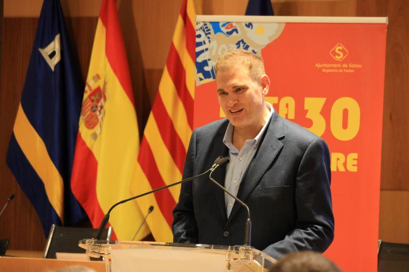 Salou. Costa Daurada. 25 octubre 2024. L'inici de la Festa Major del 30 d'Octubre de Salou no podia començar millor: amb un pregó ovacionat pel públic assistent en què el record del passat i l'afany de continuar treballant pel futur han centrat els discursos de l'alcalde, Pere Granados, i del pregoner, el president del Club de Bàsquet Salou, Santiago Benito.