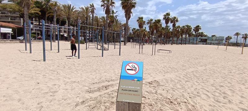 Salou. Costa Daurada. 04 juny 2024. La platja de Ponent de Salou disposa aquest estiu d'una zona senyalitzada de gairebé 12.000 metres quadrats lliure de fum, és a dir, on no es pot fumar o vapejar. Aquesta àrea és a prop del Club Nàutic i inclou un parc infantil i espais per a la pràctica esportiva a la platja (calistènia i voleibol, entre d'altres).