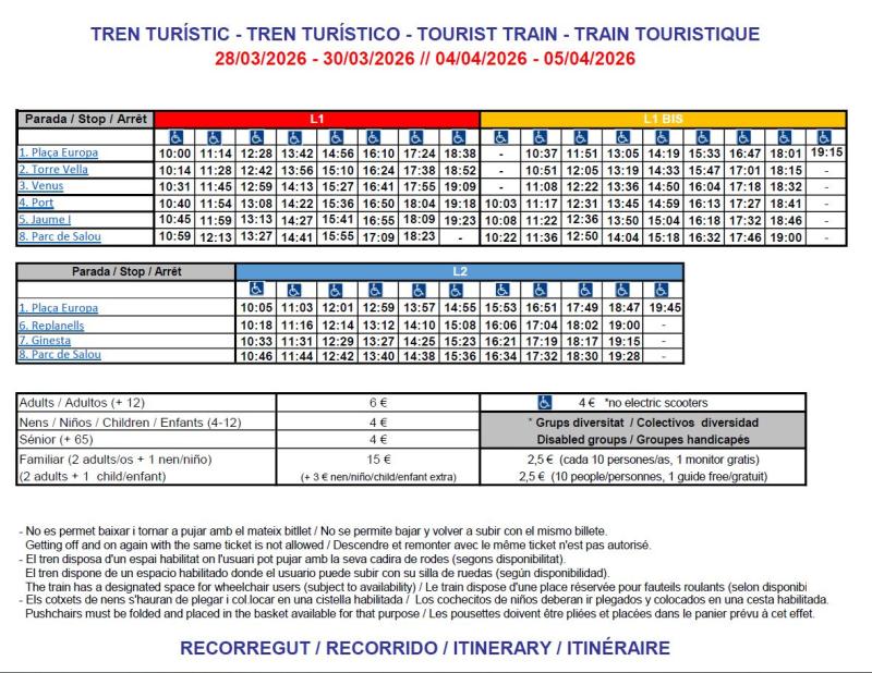 tren turístic. Ofereix un únic recorregut que permet descobrir els racons més bonics i emblemàtics, com ara el Monument a Jaume I, les Fonts Ornamentals, la Capitania, els Xalets Modernistes, el Monument al Pescador, el principi del Camí de Ronda o de Costa, la Masia Catalana , el Parc de la Ciutat, la Torre Vella, l'església de Santa Maria del Mar, del segle XVIII. A més, el tren arriba fins a PortAventura World. Els preus i els horaris són els que s'indiquen més avall per al 2026.