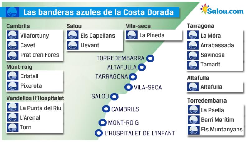 Salou. Costa Dorada. The beaches of the Costa Dorada this summer have achieved up to 19 blue flags, between the towns of L'Hospitalet de l'Infant and Vandellós, Cambrils, Montroig, Vila-seca, Altafulla, Torredembarra, Tarragona and Salou. The blue flag is a distinction that gives the Association of Environmental and Consumer Education (ADEAC), certifying that the beaches exceed about exams higiénicas conditions, security, access to pool, in Compliance with regulations and vigente of attention to the people with a disability. This award is given each year since 1987, and is given to those beaches that pass the exams hygiene, security, free access, sustainability, legislative compliance, care for people with disabilities and offer supplementary education, among others. The Blue Flag awards are participating in voluntary environmental initiatives of local authorities, local people and visitors and the tourism industry players. This year, in the Costa Dorada, a total of 37 beaches and the Marina will have 8 Blue Flag. All the blue flags of the Costa Daurada and Terres de l'Ebre