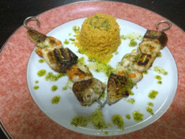 Cocinero: Dani Stoica Tipo de cocina: Mediterránea Capacidad: 45 personas Horario: De miércoles a domingo de 12.30 a 15.30h Martes de 20.00 a 22.30h. Descanso semanal: Lunes y martes mañana. Precio: 35 euros Dirección: Puerto Deportivo, locales 20 y 21 – L’Hospitalet de l’Infant Propuesta de menú: Entrante: Ancoas caseras en aceite de oliva. Primer plato: Brochetas de atún, emperador y langostinos, con arroz al curry. Segundo plato: Bogavante a la parrilla Postres: Peras al vino tinto. Bodega: Vino blanco (Barbadillo) Brochetas de atún, emperador y langostinos, con arroz al curry Ingredientes para 4 personas - 500gr. de atún - 500 gr. de emperador - 16 langostinos grandes - 400 gr. de arroz - 2 cucharadas de curry - Sal - Aceite de oliva virgen RECETA Hervimos el arroz en el agua donde hemos puesto las 2 cucharadas de curry. Montamos las brochetas en un pincho alternando los dados de atún y emperador con los langostinos. Una vez montadas las brochetas las salamos y las hacemos a la plancha. Seguidamente, montamos el plato con las dos brochetas y el arroz a un lado. Antes de servirlas las regamos con un poco de aceite de oliva virgen.